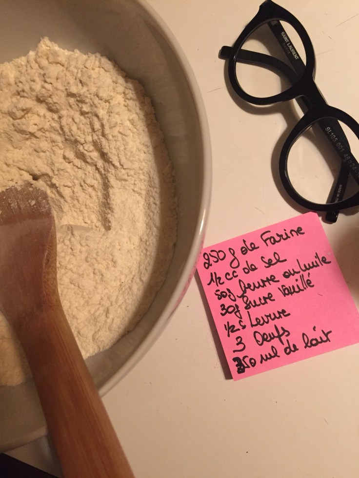 Mélanger la farine, le sel, le sucre, la levure, ajouter les oeufs, 1 par 1, puis le beurre et le lait, petit à petit pour éviter les grumeaux.